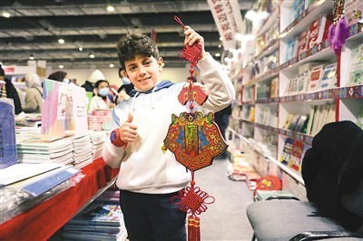 2022年開羅國際書展上,一個(gè)男孩在中國圖書展位展示春節(jié)裝飾。