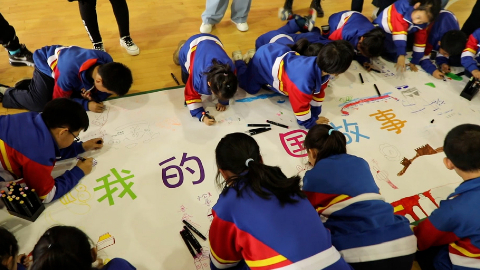 學生在繪本進校園活動中手繪畫布“我的中國故事”