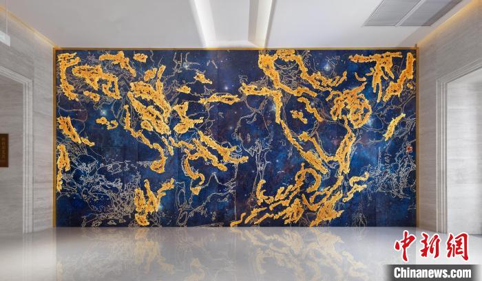 記者了解到,這幅熔銅壁畫采用國家級非遺銅雕技藝,結(jié)合熔銅藝術(shù)、釉彩著色等創(chuàng)新技藝制作而成,從設(shè)計、制作、誕生,全程歷時一年,難度很大。壁畫以朱炳仁手繪的星空“云水墨”制作,用大面積深藍宇宙為底,采用熔銅藝術(shù)構(gòu)成繁星點點。