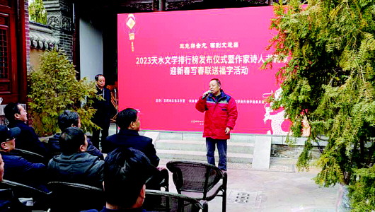 近日,由王若冰文化工作室組織評選的“2023天水文學(xué)排行榜”上榜作品揭曉,15位作家的15篇(部)作品榮登榜單。同時,2023天水文學(xué)排行榜發(fā)布儀式暨作家詩人書畫家“迎新春 寫春聯(lián) 送福字”活動在天水古城三號院舉行。