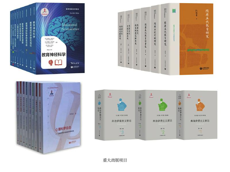 上教社密切關注新時代教育發(fā)展的重大理論問題與現實問題,響應國家教育發(fā)展戰(zhàn)略需求,精心布局學術專業(yè)出版“大項目”,連續(xù)入選國家重點出版物出版規(guī)劃、2013—2025年國家辭書編纂出版規(guī)劃,獲國家出版基金資助。這其中除前文中的大型??乒ぞ邥?,還包括一系列教育與心理學原創(chuàng)研究和前沿研究成果:由中國教育史學者孫培青編著的“隋唐五代教育與考試研究叢書”,構建了反映隋唐五代教育與考試全貌的教育理論體系和文獻資料體系,是中國教育史學科建設的一項學術文化積累工程;《中國課程史》以現代課程理論為分析框架,以歷史線索展現中國學校課程的新陳代謝;“教育神經科學譯叢”(9冊)是我國首個聚焦教育神經科學這一國際教育研究前沿領域的學術譯介系列;《中國傳統德育心理學思想新論》系統挖掘整理中華優(yōu)秀傳統文化中蘊含的德育心理學思想,構建中國特色心理學話語體系;我國第一套以大心理學觀,從本土心理學視角系統探索和解讀不同形態(tài)心理學的學術系列“心理學形態(tài)研究系列”(6冊),全景考察心理學的命運與前途,深入探索中國本土心理學的選擇與突破;《弗洛伊德主義新論》(三卷)匯聚國內弗洛伊德主義研究領域的權威學者,歷史展現弗洛伊德理論的百年發(fā)展歷程,提供弗洛伊德主義研究的“全景圖”。這些重大出版項目為構建中國特色自主知識體系,建設中國教育學和心理學學科體系、學術體系、話語體系發(fā)揮了重要作用。