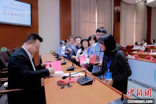 圖為邱華棟向部分參會代表進行現(xiàn)場簽名贈書?!?nèi)蒙古師范大學(xué)供圖