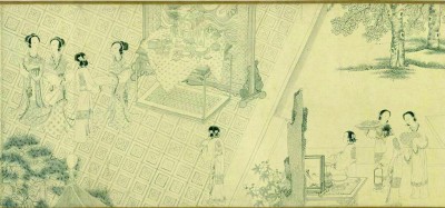 明代仇英《乞巧圖》(局部,臺(tái)北故宮博物院藏),表現(xiàn)的是在庭院中陳設(shè)幾筵、瓜果祭祀牛女的場(chǎng)景