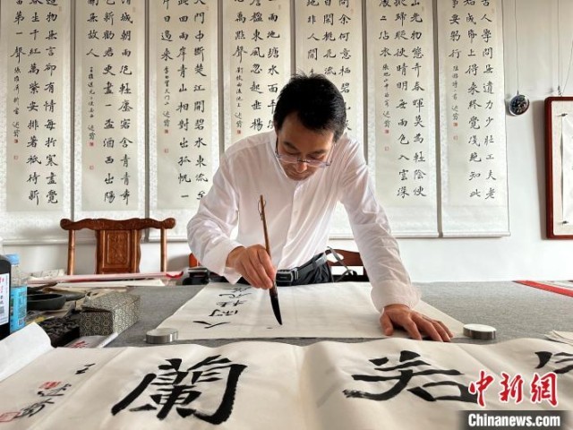 “我從小練習(xí)繪畫,從學(xué)校畢業(yè)后直接回縣里開了自己的書畫工作室,現(xiàn)在入駐悅心國際書畫村,收入還可以。最主要耐得住寂寞,靜下心來打磨技藝。”“90后”通渭本土?xí)嫾伊茉诋?dāng)?shù)匦∮忻麣?。他說,書畫在年輕群體當(dāng)中很受歡迎,尤其前來跟他學(xué)習(xí)的學(xué)生很多。