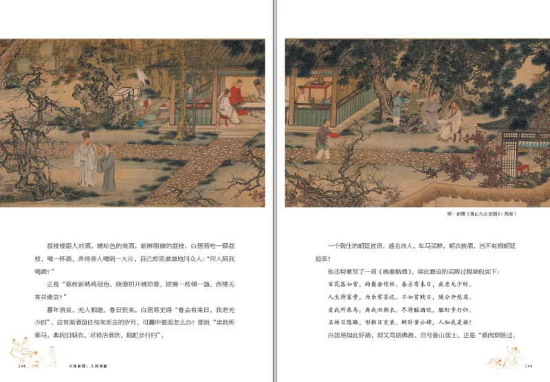 值得一提的事,這本書有很多稀見的插圖。比如讀到司馬相如的時(shí)候,配有明代仇英的《上林圖》;比如說曹植,所用的顧愷之《洛神賦圖》也是根據(jù)曹植傳世名篇《洛神賦》而來;寫白居易則是用謝環(huán)的《香山九長(zhǎng)老圖》。