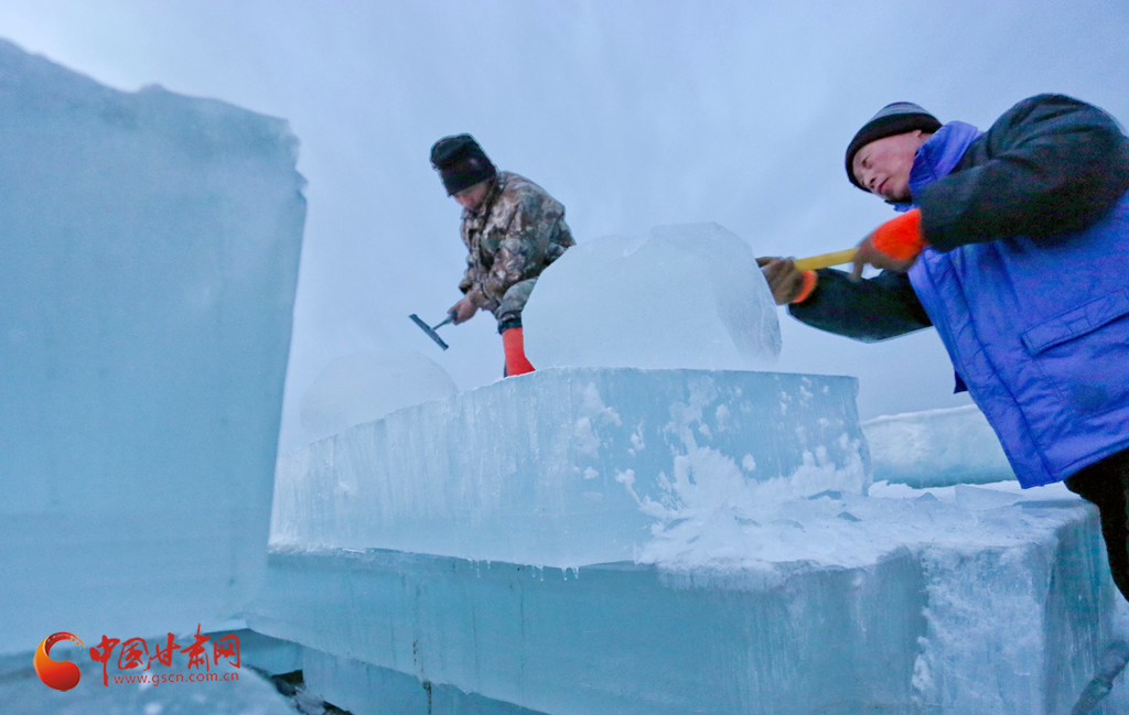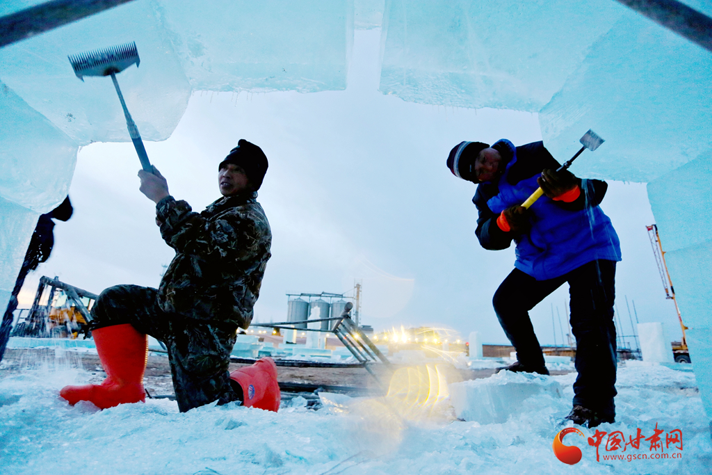 1月11日傍晚,張掖市甘州區(qū)屋蘭古鎮(zhèn)九曲黃河燈陣景區(qū)冰雕工藝師們正在加班加點趕制大型冰雕。