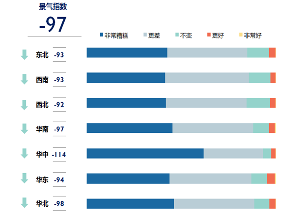 《報(bào)告》稱(chēng),受疫情影響,全國(guó)各地對(duì)于旅游到訪(fǎng)目的地的景氣預(yù)期同樣極度消極,7大地區(qū)市場(chǎng)的平均景氣指數(shù)跌至-97。其中,受疫情影響最為嚴(yán)重的華中地區(qū)景氣指數(shù)最低。同樣的,目的地景氣指數(shù)也表現(xiàn)出疫情影響越嚴(yán)重,指數(shù)表現(xiàn)越低的趨勢(shì)。