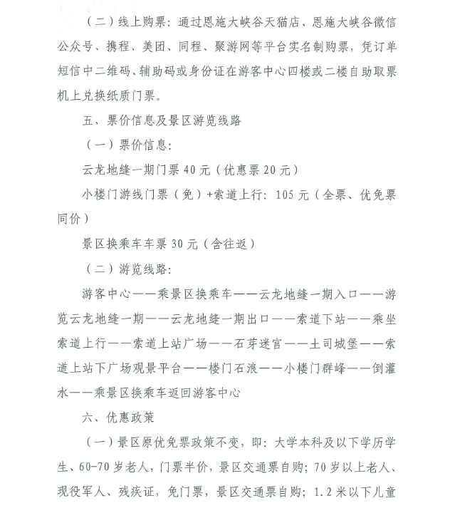 優(yōu)惠政策方面,景區(qū)原優(yōu)免票政策不變;與此同時(shí),全國(guó)醫(yī)護(hù)人員、援鄂醫(yī)療隊(duì)員、天津援助恩施醫(yī)療隊(duì)員按湖北省文旅廳、恩施市文旅局相關(guān)優(yōu)惠政策(憑有效證件)免門票;天津市民憑有效證件享受門票半價(jià)。