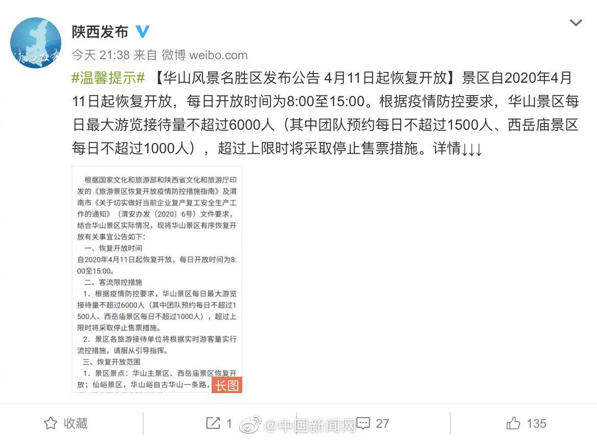 華山風景名勝區(qū)4月9日發(fā)布公告,宣布華山風景區(qū)4月11日起恢復開放。據@陜西發(fā)布 華山風景名勝區(qū)發(fā)布公告稱,自2020年4月11日起恢復開放,每日開放時間為8:00至15:00。