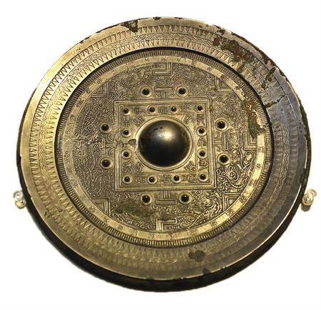 漢代設(shè)專門(mén)的機(jī)構(gòu)和官職管理銅鏡制作,有記載:“少府之下有尚方令一人,御用及官制銅鏡均由尚方制作”。所謂“規(guī)矩紋”是一種類似英文字母“T”“V”“L”的符號(hào)組成,這三種符號(hào)裝飾規(guī)整,稱之為“規(guī)矩紋”。在銅鏡之上一般還有瑞獸圖案,起到了祈福保佑的作用。