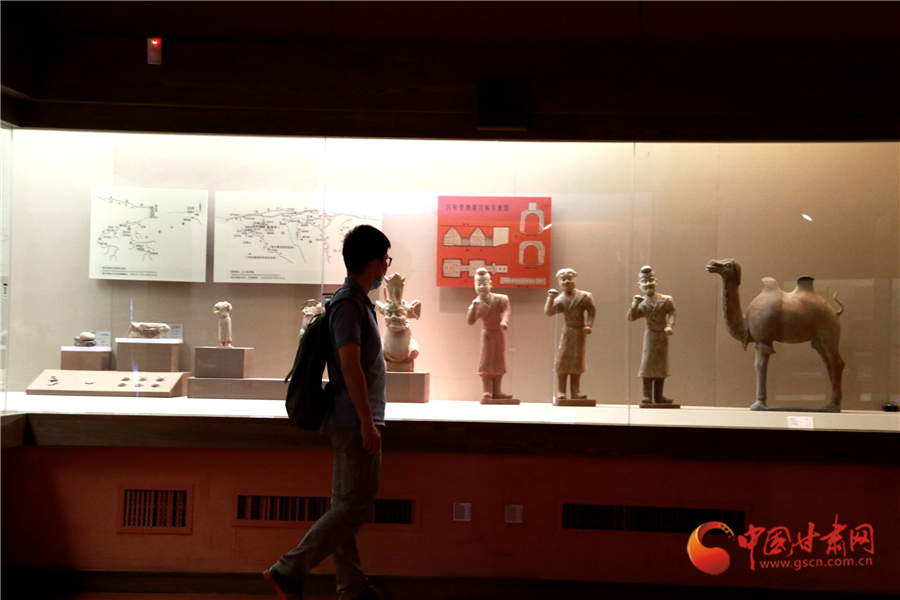 2020年5月18日,游客在甘肅省敦煌市博物館參觀文物展。