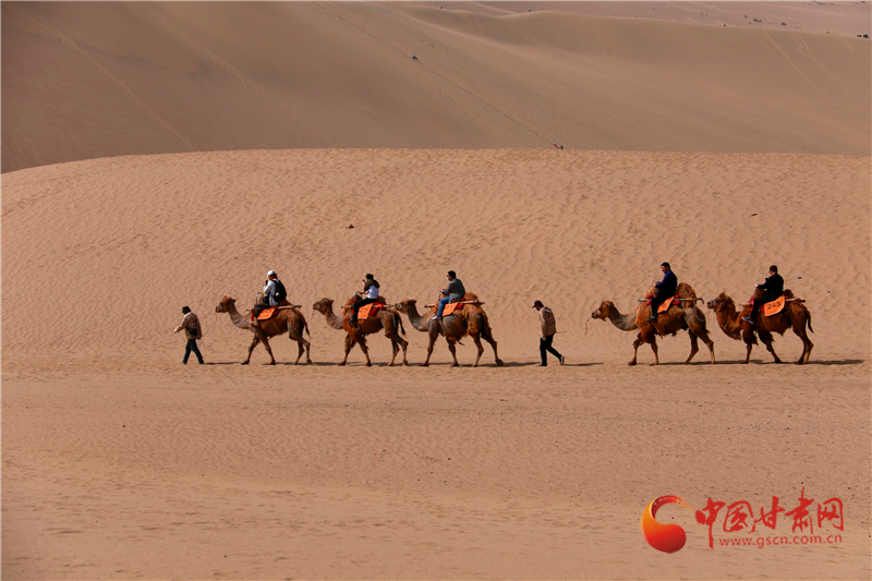 5月19日是中國(guó)旅游日,游客來(lái)到甘肅省敦煌市鳴沙山月牙泉景區(qū),欣賞大漠壯美風(fēng)光,體驗(yàn)獨(dú)特絲路風(fēng)情。