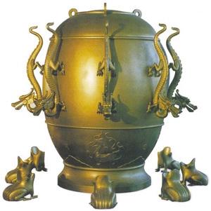 從此,張衡在天文學(xué)和星象體系方面的聰明才智如噴發(fā)的涌泉一發(fā)不可收:候風(fēng)儀、指南針、記里程鼓車、會飛的木雕等等,一個個科學(xué)發(fā)明成果相繼推出,并在公元132年研制出了地動儀。地動儀是世界上最早的觀測地震的儀器,它比歐洲創(chuàng)造類似的地動儀早1700多年。