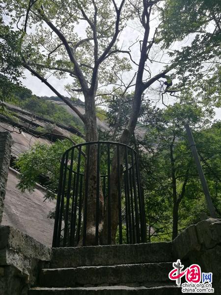 于是,我開(kāi)始沿著陡峭的石階,一步一步地向上攀登。上不過(guò)百余級(jí),一株如巨傘狀的天目紫莖躍然眼前。樹(shù)四周用茶杯粗細(xì)鋼筋柵欄緊緊圍住,可見(jiàn)景區(qū)對(duì)此珍貴名木的重視。仔細(xì)觀(guān)察,估計(jì)樹(shù)齡至少在500年以上,其主干樹(shù)皮細(xì)滑,骨感十足,上部枝丫自然舒展,覆蓋出去,周?chē)魃G樹(shù)恰似眾星拱月般,與其相擁成趣。