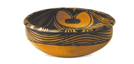 馬家窯文化馬家窯類型(距今約4800年),1966年蘭州市王保保城出土。這是一只工藝精湛,保存完好的彩陶盆,這只旋紋彩陶盆最大的特點是盆內(nèi)壁上繪的三組變體人面紋,同學(xué)們看出這組圖像人面嗎?看懂人面紋需要發(fā)揮想象力,總之,我們的先祖抽象表達(dá)的能力及想象力真令今人景仰!