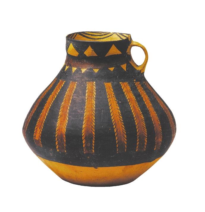 馬家窯文化馬家窯類型(距今約4800年),1971年隴西縣首陽公社呂家坪出土。這只彩陶瓶最亮眼的特點當(dāng)屬瓶身上三組旋渦紋了,這三組用黑彩繪就的連續(xù)旋渦紋與瓶頸的平行弦紋聯(lián)系,圖案華美勻稱,連綿不斷卻疏密有致,真難想象,近5000年前的古人繪畫技藝竟如此精湛!這只彩陶瓶另有一個奇特處同學(xué)們發(fā)現(xiàn)了嗎?此瓶的瓶底為什么是尖的,尖底可怎么置放?想必是用繩子系著瓶的兩耳懸掛著用的。