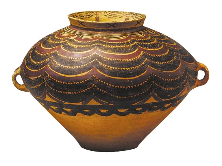 馬家窯文化半山類型(距今約 4500 年),廣河縣地巴坪出土。這是雙耳甕器型大氣貴重,施以紅、黑二彩,紅、黑彩交替使用,腹部繪多層連續(xù)垂弧紋和鋸齒紋,黑、紅彩交替使用,由三組分層連續(xù)的垂弧紋組成整體圖案,每層由兩層黑色帶紋和一層紅色帶紋組成,黑色帶紋上緣繪向上的鋸齒紋。整個圖案密集繁復(fù),俯視猶如一朵盛開的鮮花,造型豐滿,色彩鮮艷。
