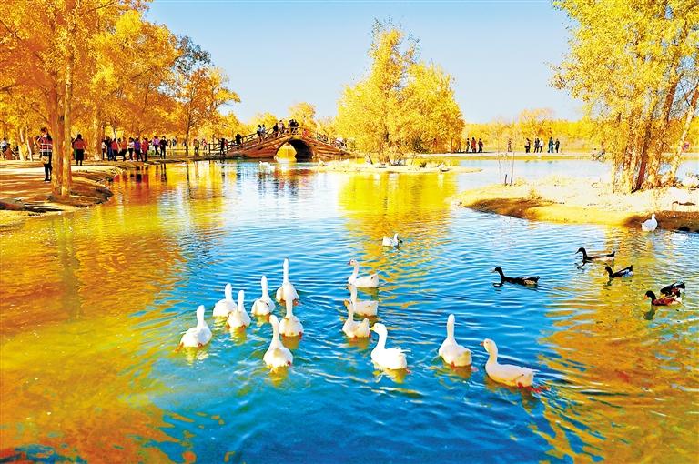 站在金波湖邊,滿目的赤橙黃綠與盈盈秋水互相映襯,胡楊金色的葉子倒映在潭水中,形成金色的水泊,微風(fēng)掠過(guò),層層漣漪漸漸擴(kuò)大,最后消失在胡楊的倩影里,構(gòu)成一幅幅精美的油畫(huà)。烘托出一幅“碧云天、黃葉地、秋色連波、波上寒煙翠”的絕美妙油畫(huà)卷。