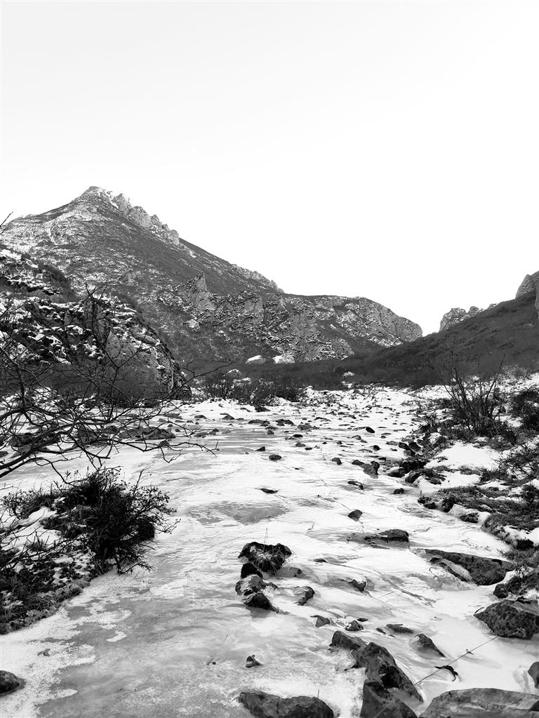 穿過公路就來到露骨山腳下,山間灌木叢生,枯葉凋零,一夜的小雪也使天空更加清澈。上山的路,總體是溯溪而上,不過腳下的小溪已經(jīng)變成冰河,但潺潺水聲不時(shí)在耳邊響起,大小石塊橫亙?cè)诒又希籽└采w其間,我們一行沿著前人在雪地留下的腳印,撥開齊胸的灌木枝,深一腳淺一腳、兜兜轉(zhuǎn)轉(zhuǎn)向前行。