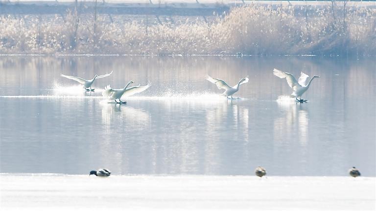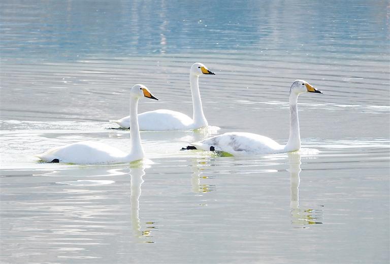 近日,永靖縣鹽鍋峽鎮(zhèn)境內(nèi)的黃河八盤峽水庫成為天鵝等候鳥越冬的樂園,它們在此棲息、覓食,成為冬日黃河里的一道靚麗風(fēng)景。 本報記者 史有東 攝