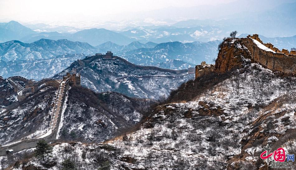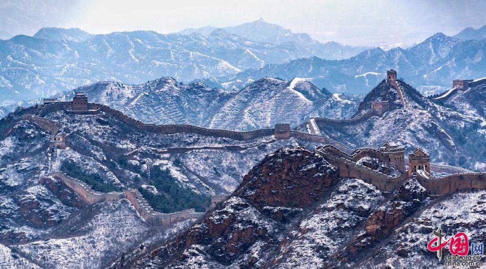 在春雪覆蓋下,山巒起伏,壯觀的長(zhǎng)城在崇山峻嶺之巔如巨龍飛舞,一幅雪墨丹青,令人向往。