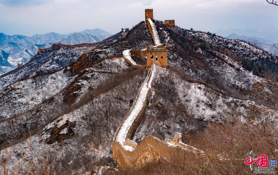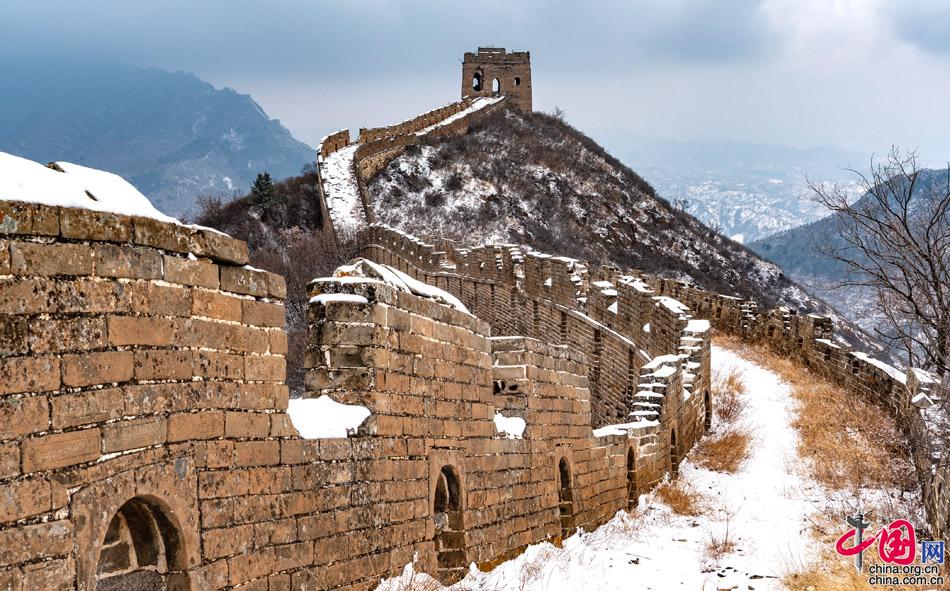 春雪飄灑,一朵朵相擁著落下,氣溫驟降,給人帶來一絲涼意。金山嶺海拔700米,長(zhǎng)城依山憑險(xiǎn),起伏跌宕于山水之間,形勢(shì)極為雄奇。金山嶺長(zhǎng)城是明代修筑的一段長(zhǎng)城,西起歷史上著名的關(guān)口古北口,東至高聳入云的望京樓,全長(zhǎng)10.5公里,沿線設(shè)有大小關(guān)隘5處,敵樓67座,烽燧2座,因其視野開闊,敵樓密集,景觀奇特,建筑藝術(shù)精美,軍事防御體系健全,保存完好而著稱于世。