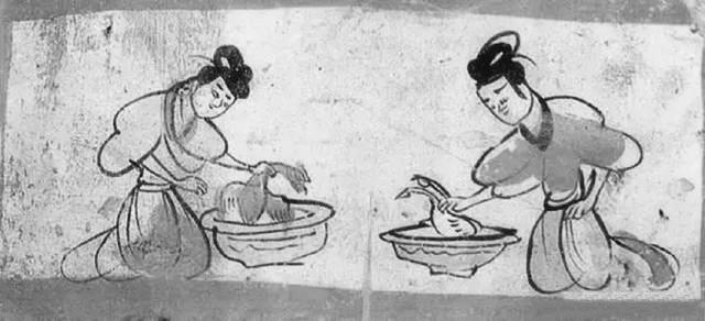 燙雞圖壁畫磚就出土于5號墓葬,這是繪制在一塊單塊磚面上的壁畫,磚面上用刷得甚薄的含膠白堊土作底,正中繪制二婢相對跪坐,袖子高高挽起,眉毛微撇,聚精會神地在各自的盆內燙雞去毛。左邊盆內雞有冠,為公雞形象;右邊盆內雞無冠,似為母雞形象。用色較為單純,以墨、赭石和朱為主。畫面寥寥數(shù)筆,將婢女勞動的情況表現(xiàn)得淋漓盡致,極具生活趣味。尤其是雞脖子被抓住的樣子非常傳神, 生動地表現(xiàn)出寫實的情境。我們從中可以看到,1600多年前的人們殺雞處理食材,跟現(xiàn)在我們殺雞燙毛毫無二致。