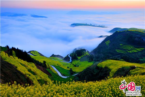 云南省羅平縣無(wú)處不風(fēng)景。春季的馬街,桃花、梨花、李花、山茶花、油菜花、杜鵑花、馬纓花把一座座山峰映襯得如詩(shī)如畫(huà)。佇立牛頭山俯視云層,漫無(wú)邊際的白云在山麓翻滾、碰撞、擁擠,雖沒(méi)有海的蔚藍(lán)與呼嘯之態(tài),卻有海的浩瀚與壯闊。站在山巔呼吸沁人心脾的清新空氣,聽(tīng)山風(fēng)掠過(guò)林梢的聲音,云霧升騰時(shí)如夢(mèng)如幻,仿佛有仙人騰云駕霧下凡而來(lái)。