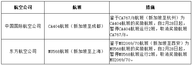 根據(jù)民航局通報,2月9日入境的中國國際航空公司CA404航班(新加坡至成都)確診新冠肺炎旅客5例,鑒于CA767/8航班(新加坡至杭州)為CA404航班的獎勵航班,自2月28日起,暫停CA404航班運行2班,取消獎勵航班CA767/8。2月10日入境的東方航空公司MU568航班(新加坡至上海)確診新冠肺炎旅客5例,鑒于MU2069/70航班(新加坡至西安)為MU568航班的獎勵航班,自2月28日起,暫停MU568航班運行2班,取消獎勵航班MU2069/70。上述熔斷的航班量不得用于其它航線。