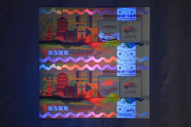 據(jù)了解,《杭州2022年第19屆亞運(yùn)會》特殊版式個性化郵票雙連張是中國集郵有限公司匠心打造的首款GPZ編號體育題材郵票,由青年設(shè)計(jì)師趙郁竹擔(dān)綱設(shè)計(jì),限量發(fā)行。它依托杭州亞運(yùn)會色彩系統(tǒng)和視覺形象元素,融歷史文化、現(xiàn)代美學(xué)和未來暢想于一體,集藝術(shù)感、科技感和運(yùn)動感于一身,展現(xiàn)中華文明、浙江風(fēng)采、杭州韻味和時代魅力,采用特殊版式、編號和工藝,紫光燈下局部呈現(xiàn)無色熒光油墨圖案和全真彩效果,傳遞中國郵政對杭州亞運(yùn)的美好祝福。(圖片由人民日報客戶端提供)