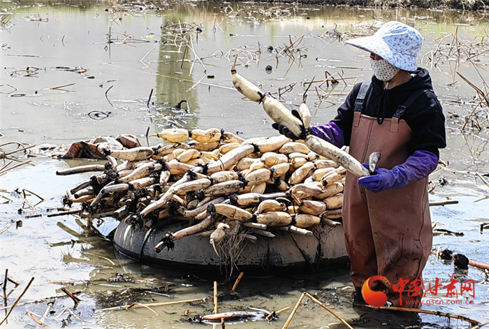 李愛芝是青城鎮(zhèn)東灘村村民,一大早她便和丈夫張興成換好了裝備,進(jìn)入池塘里開始采摘蓮藕。張興成憑著手中高壓水槍“探路”,一步步艱難挪動(dòng),在淤泥里手腳并用尋找肥壯的鮮藕,幾乎整個(gè)身體都是趴在水面上,佝僂著腰,雙手盡力伸入淤泥,張興成的挖藕效率還算不錯(cuò),伴隨著一連串嫻熟的動(dòng)作,不一會(huì)兒,一根根粗大的蓮藕漂浮在他身旁的水面上,李愛芝則將蓮藕身上的淤泥清洗干凈后裝拉回岸邊進(jìn)行分裝。