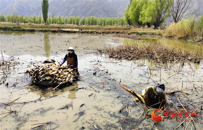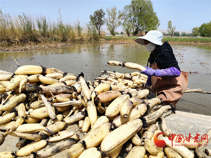 近日,記者來到榆中縣青城鎮(zhèn)東灘村,在青城五良養(yǎng)殖場(chǎng),記者看到不遠(yuǎn)處的池塘里,村民們正在采收蓮藕,魚塘中的鯉魚拍打著水花,成群結(jié)隊(duì)搶食……一幅熱鬧豐收的圖景躍然眼前。