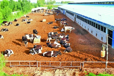 張掖市高臺(tái)縣巷道鎮(zhèn)東聯(lián)村的奶牛養(yǎng)殖場(chǎng) 藺鵬攝/光明圖片