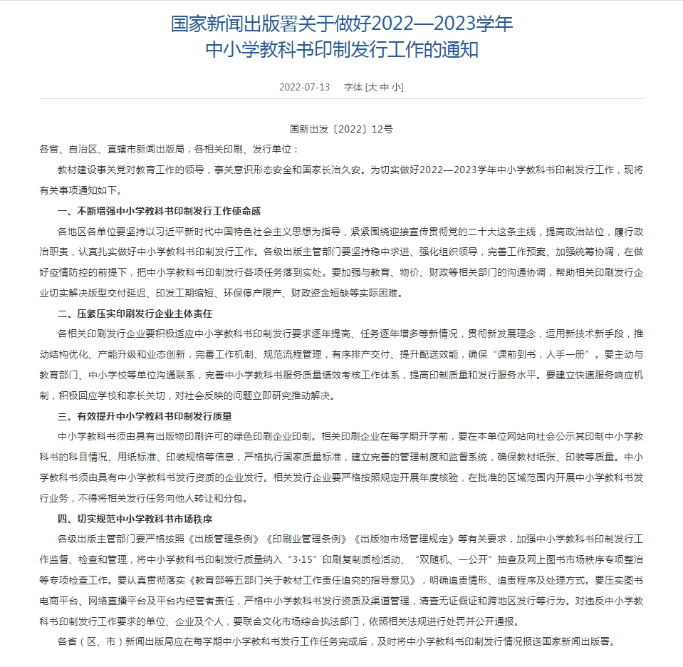 13日,國家新聞出版署網(wǎng)站發(fā)布《國家新聞出版署關(guān)于做好2022—2023學(xué)年中小學(xué)教科書印制發(fā)行工作的通知》(以下簡稱《通知》)。其中強(qiáng)調(diào),各相關(guān)印刷發(fā)行企業(yè)要積極適應(yīng)中小學(xué)教科書印制發(fā)行要求逐年提高、任務(wù)逐年增多等新情況?!锻ㄖ返淖詈蟊硎?,要切實規(guī)范中小學(xué)教科書市場秩序。