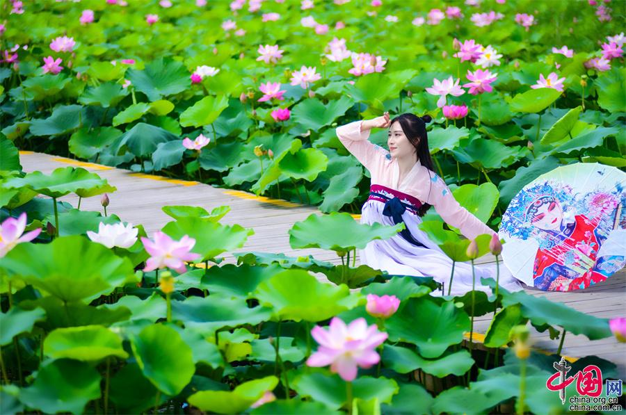 原標(biāo)題:寧夏沙湖: 接天蓮葉無窮碧 國(guó)風(fēng)漢服映荷塘(圖)