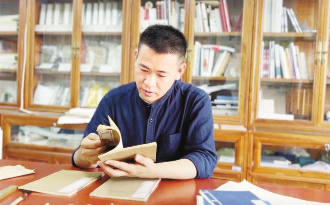 他一邊輕輕撥弄著桌案上泛黃的紙頁(yè),一邊用毛筆蘸上漿糊,粘補(bǔ)書頁(yè)上的缺損部分。