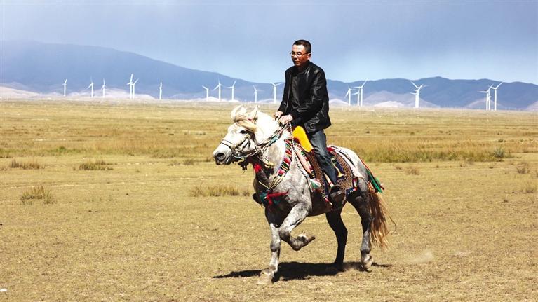 驅(qū)車向草原腹地進發(fā),遠遠就能看見有人在馴馬。馴馬者房利軍和他的坐騎“尕青”仿佛“人馬合一”,同呼吸、共步調(diào),一遍遍練習,像走,更像飛。這便是傳說中的走馬文化,和跑馬的加速度不同,走馬不管是走還是跑,都是快步勻速,短途速度快,長途耐力強,騎乘平穩(wěn),姿態(tài)優(yōu)美,觀賞性強。在牧區(qū),走馬實用性強,深受當?shù)厝藲g迎。曾有專家稱,“馬踏飛燕”的“馬”即為走馬。每天,和武威天祝一山之隔的這片草原,都與房利軍有關(guān),在這里,他專心馴馬,而他的500只羊則在一旁撒歡。尤其從高空俯瞰,草原牧羊的畫面甚是壯觀??赐犟Z馬,房利軍騎馬帶路,采訪車沿著馬道回到了“家”。