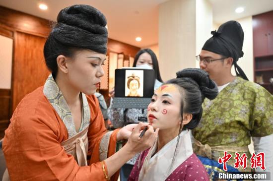 10月9日晚,廣西南寧市一攝影棚內,南寧傳統(tǒng)服飾復原團隊化妝師鄭若楠依據(jù)陶俑文物圖片為模特上面妝。