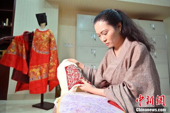 蔣雨林展示其手工復原制作的漢服飾紋路。