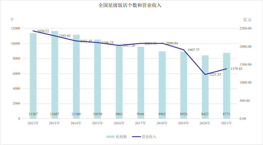 數(shù)據(jù)顯示,截至2021年,全國星級飯店總數(shù)達(dá)到8771個,營業(yè)收入達(dá)到1379.43億元。