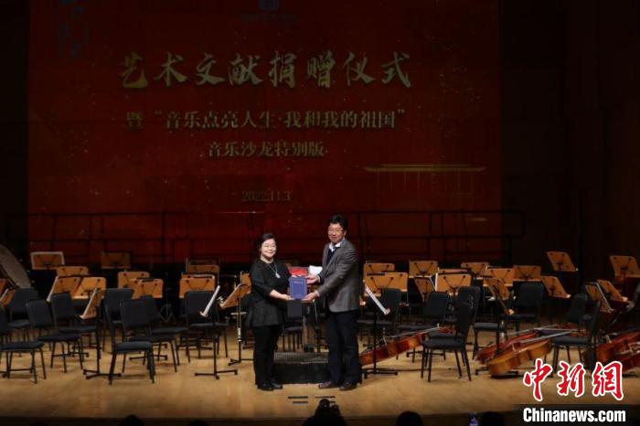 國家圖書館重要藝術(shù)文獻捐贈儀式暨“音樂點亮人生·我和我的祖國——音樂沙龍?zhí)貏e版”活動3日晚在國圖藝術(shù)中心·音樂廳舉辦。國家圖書館黨委書記、副館長魏大威接受捐贈,并為捐贈人代表中央民族歌舞團民樂團團長馬蘭花頒發(fā)捐贈證書。
