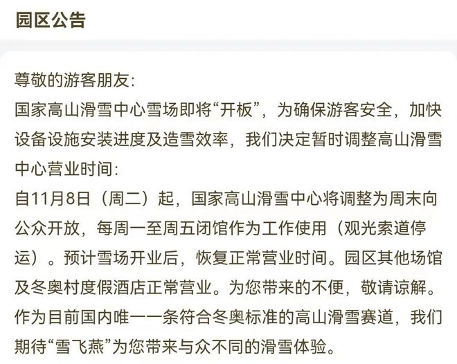根據(jù)公告,自11月8日(周二)起,國家高山滑雪中心將調(diào)整為周末向公眾開放,每周一至周五閉館作為工作使用(觀光索道停運(yùn))。預(yù)計(jì)雪場開業(yè)后,恢復(fù)正常營業(yè)時(shí)間。目前,“雪飛燕”已對(duì)外開放,如果纜車開放,便可以乘坐纜車上到山頂。