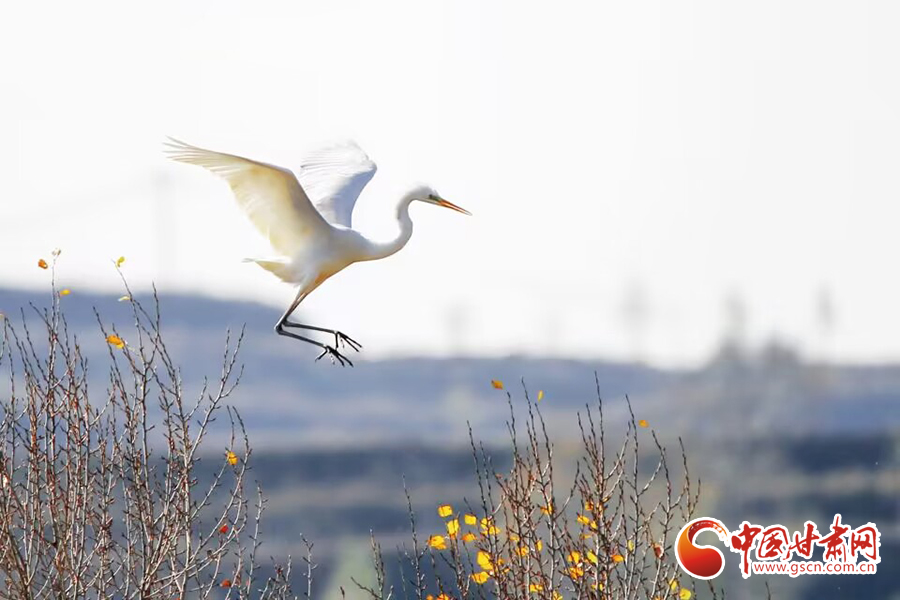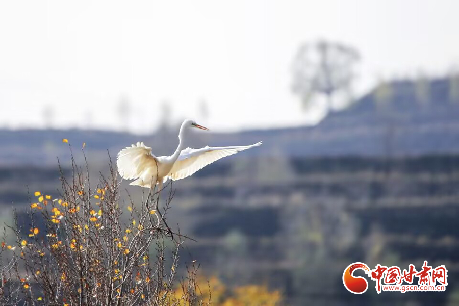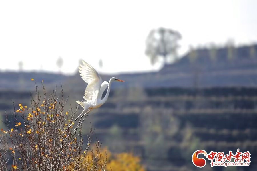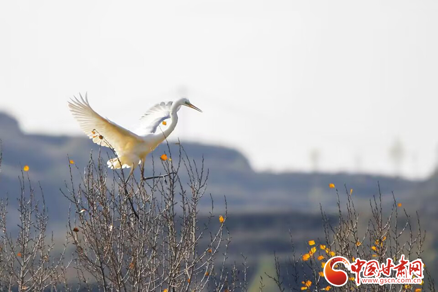 初冬時(shí)節(jié),在平?jīng)鍪谐缧趴h于家灣鷺鳥(niǎo)紛飛,繪就一幅人與自然和諧共生的美麗畫(huà)面。