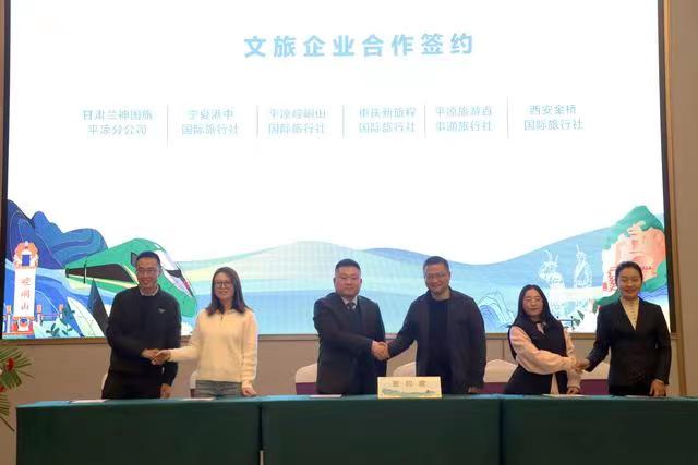 專題推介會(huì)上,平?jīng)鍪形幕瘡V電和旅游局推介了全市文旅資源及“引客入平”系列支持政策,崆峒山、大云寺·王母宮、龍泉寺、云崖寺等重點(diǎn)景區(qū)和涇川橙香瑤池溫泉酒店分別作了主題推介。平?jīng)鑫穆猛豆九c西安一帶一路文旅公司、涇川大云恒盛旅游公司與西安黃河國(guó)旅、崇信公劉文旅投公司與寶雞春暉旅行社、莊浪關(guān)山文旅投公司與寧夏新文化國(guó)旅、崆峒山國(guó)旅與重慶新旅程國(guó)旅、甘肅蘭神國(guó)旅平?jīng)龇止九c寧夏港中國(guó)旅、平?jīng)雎糜伟偈峦ㄅc西安金橋國(guó)旅等14家省內(nèi)外旅行社分別簽訂“引客入平”客源互送合作協(xié)議。推介環(huán)節(jié)還進(jìn)行了《神仙留戀的好地方》《崆峒武術(shù)魂》《折柳》和《春天的芭蕾》等文藝表演,與會(huì)嘉賓參觀了“問(wèn)道崆峒·養(yǎng)生平?jīng)?rdquo;文旅形象圖片展、文旅產(chǎn)品市集、非遺技藝展示及網(wǎng)絡(luò)直播和非遺文創(chuàng)產(chǎn)品展。甘肅省文旅廳有關(guān)處室、各相關(guān)市州文旅部門(mén)負(fù)責(zé)人和省內(nèi)外旅行商、文旅企業(yè)、媒體記者代表,平?jīng)鍪兄攸c(diǎn)景區(qū)、文旅投公司、文創(chuàng)企業(yè)代表共150余人參加。