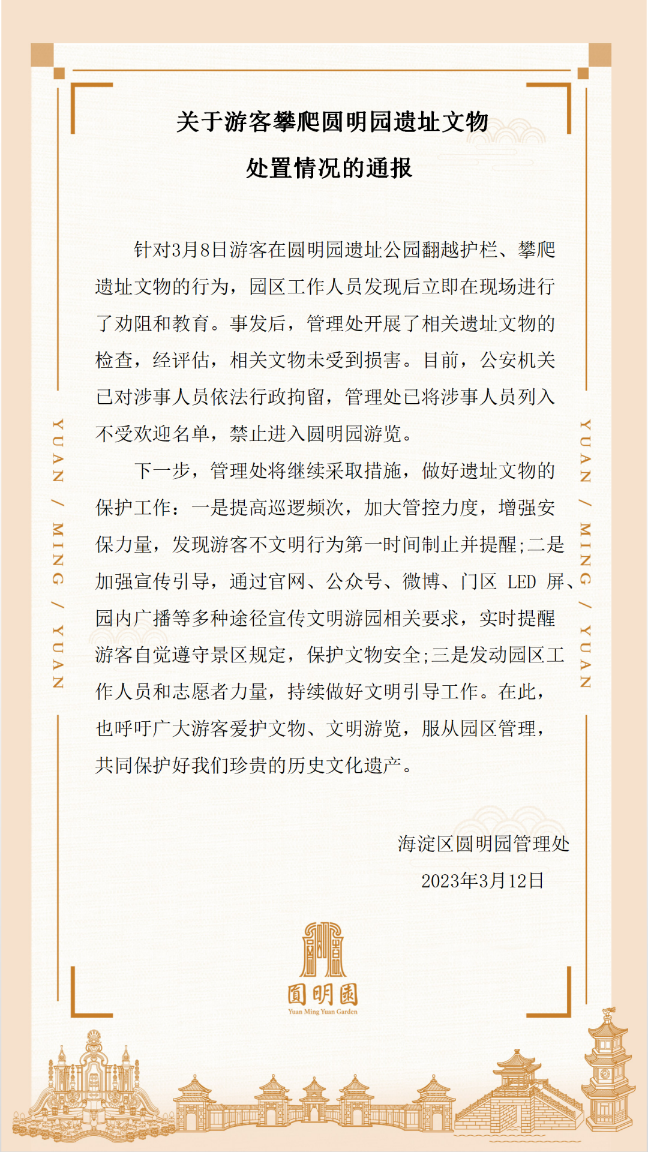 《通報》指出,針對3月8日游客在圓明園遺址公園翻越護(hù)欄、攀爬遺址文物的行為,園區(qū)工作人員發(fā)現(xiàn)后立即在現(xiàn)場進(jìn)行了勸阻和教育。事發(fā)后,管理處開展了相關(guān)遺址文物的檢查,經(jīng)評估,相關(guān)文物未受到損害。目前,公安機(jī)關(guān)已對涉事人員依法行政拘留,管理處已將涉事人員列入不受歡迎名單,禁止進(jìn)入圓明園游覽。