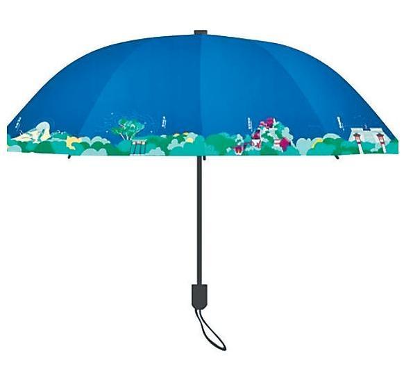 畫面是對(duì)天水文化的整合轉(zhuǎn)譯。靜謐的深藍(lán)夜色宛如舒緩溫柔的吟唱,點(diǎn)醒具有暗語的想象。連綿起伏的綠影又將目不暇接的八美之景串聯(lián)起墜于傘邊沿,呈現(xiàn)一種清新淡雅的格調(diào)。四字榜題作為光影與畫面間的調(diào)和劑潤化了視覺美感,使空間溢滿文人逸趣。簡潔平穩(wěn)的畫卷里隱含古雅山水的形象,靈動(dòng)漂浮的畫卷里創(chuàng)立起意蘊(yùn)美學(xué)。
