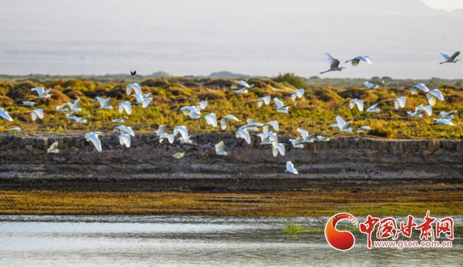 初夏,數(shù)批遷徙候鳥陸續(xù)集結(jié)在國家級公益林甘肅省瓜州縣老師兔保護(hù)區(qū)水域“做客”。成千上萬只珍稀水鳥將濕地變?yōu)闃穲@,時而在水面上展翅飛翔,時而覓食戲水,一幅風(fēng)光旖旎、生機(jī)盎然的生態(tài)美景。