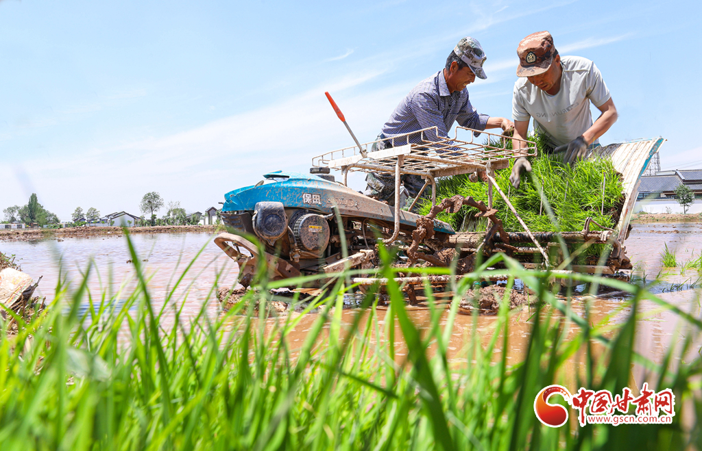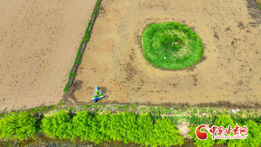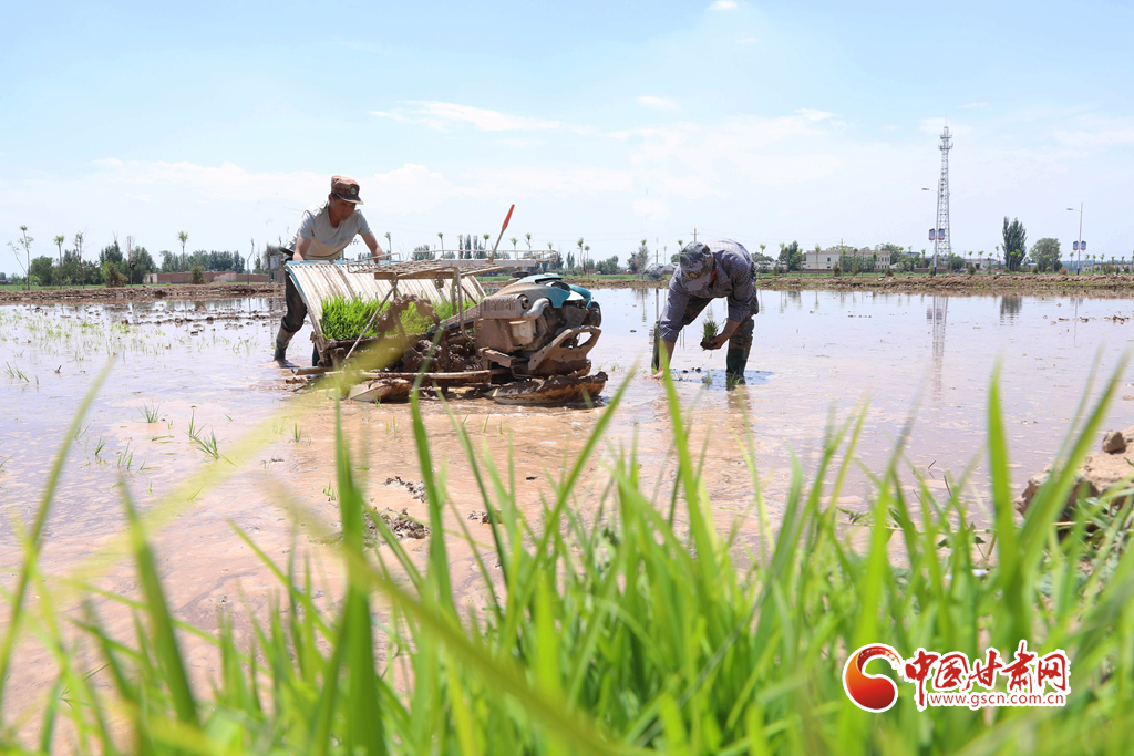 6月5日,祁連山北麓,甘肅省張掖市甘州區(qū)烏江鎮(zhèn)、靖安鄉(xiāng)的稻田里,插秧機(jī)同農(nóng)戶來回穿梭插秧,2200多畝稻田進(jìn)入了繁忙插播中。