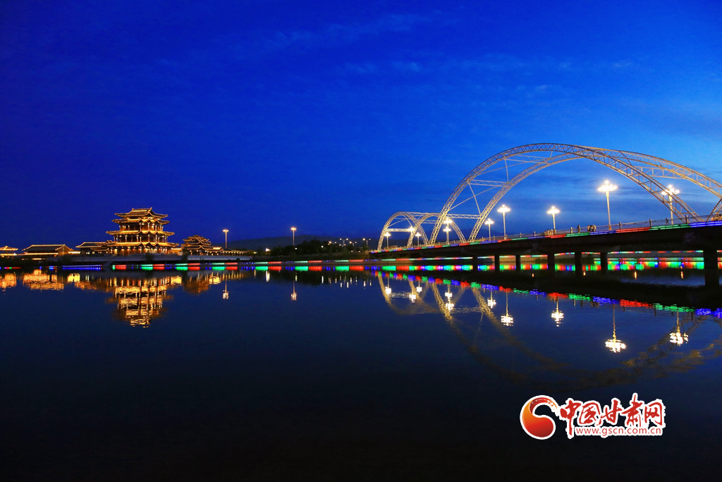 7月5日,甘肅省嘉峪關市南湖討賴河畔晚霞如輝,夜景璀璨,構成一幅美麗的夏日畫卷。