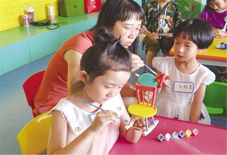 為了讓孩子們切身體驗魯班的精湛技藝,在手工制作環(huán)節(jié),大家進行了榫卯結(jié)構(gòu)的椅子模型拼裝。在主持人的帶領(lǐng)指導(dǎo)下,孩子們將椅背、椅腿按照凹槽精準(zhǔn)嵌入,并為其染上五彩底色、繪制精美圖案,一個個“小工匠們”便歡天喜地地完成了自己的手工作品。